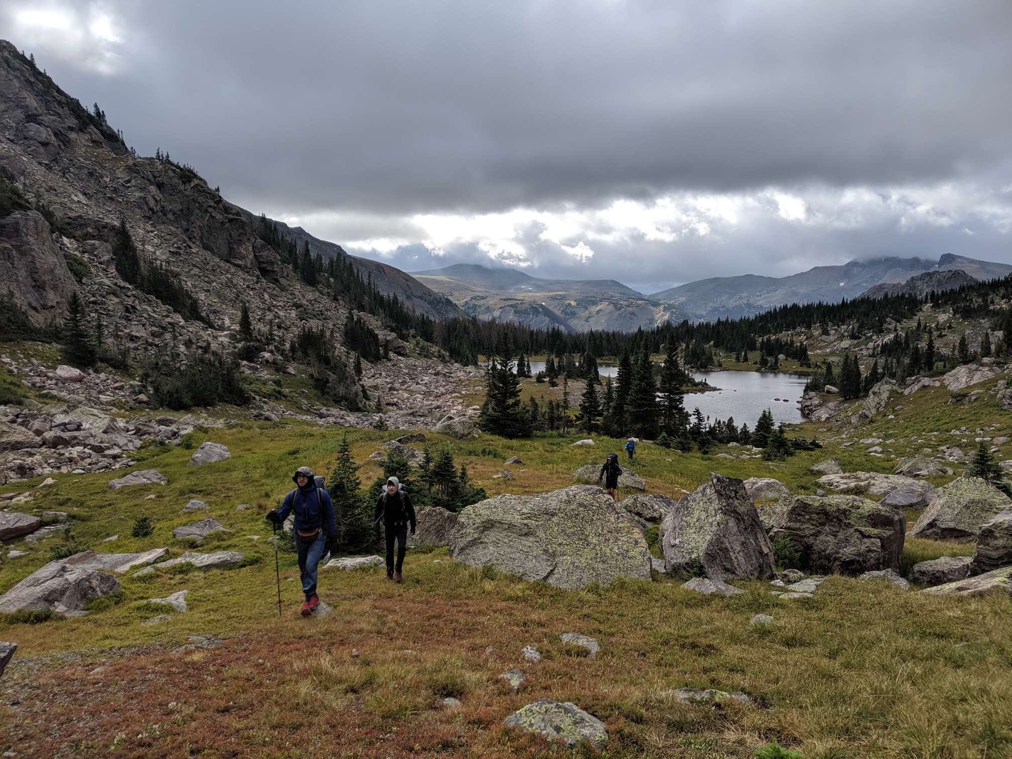 Day 3: We get an alpine start in the morning meaning we wake up very early to start walking because the weather is supposed to really suck. The forecast is for thunderstorms by early afternoon and we have to walk across the divide before that happens. By 8am clouds are already building. We're hoping to be able to walk up to Taylor Peak along the way, but it's a weather dependent situation. By the time we get to the decision point it looks terrible. I've spent a total of 6 years living in Colorado, so I know how quickly the weather can turn here. Perhaps to instill a little fear in the folks who haven't had direct experience with Colorado weather, Alan tells the group that he'll go up Taylor but only if we're ready to hike down in thunder and lightning with "50 mile an hour winds and 35 degree rain." I can't square the idea of wanting to do something with that potential outcome so I skip the peak after teetering in the middle between both options while each group walks away from me. The group that goes up only gets sleeted on and experiences mere 30 mph wind. In the end I wish I had braved the weather, but Alan wasn't wrong about the potential for it to take a bad turn.