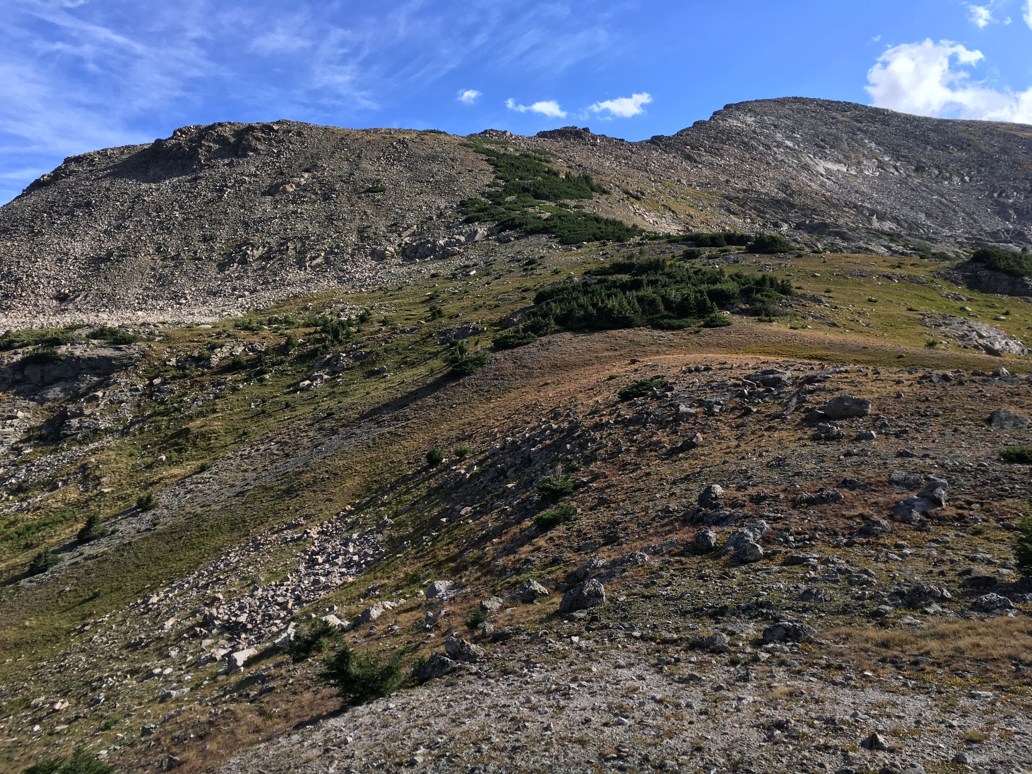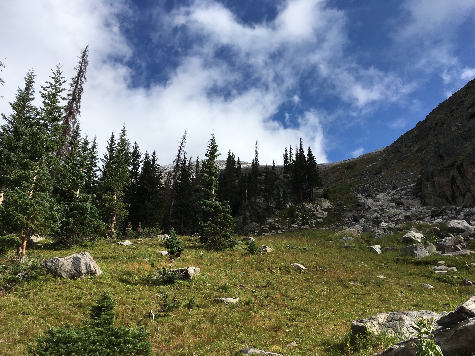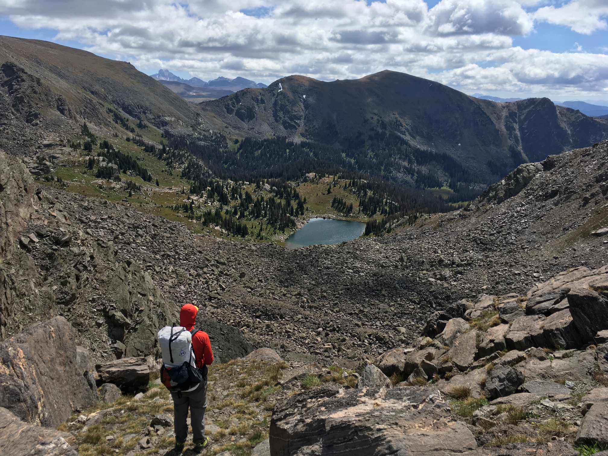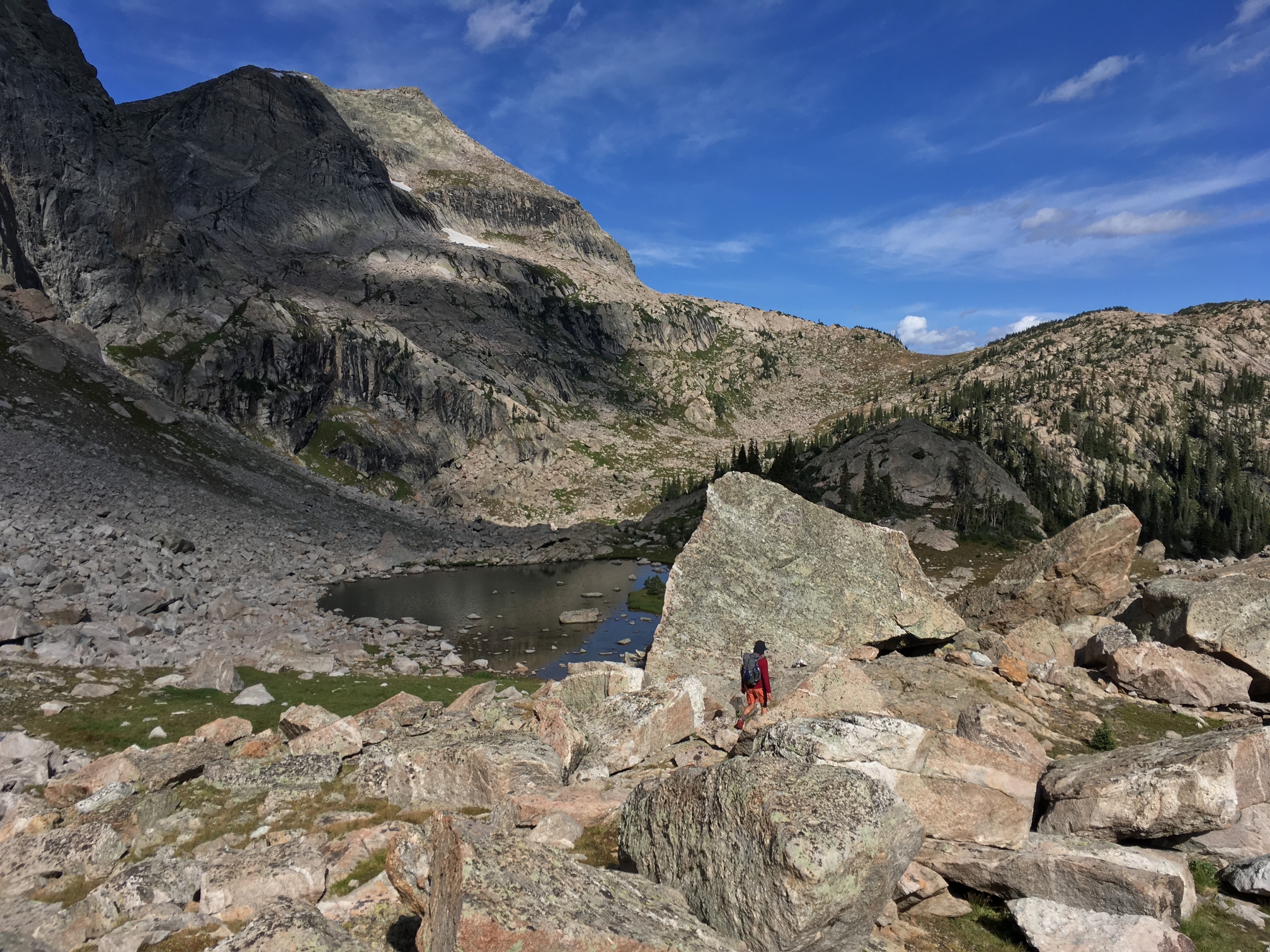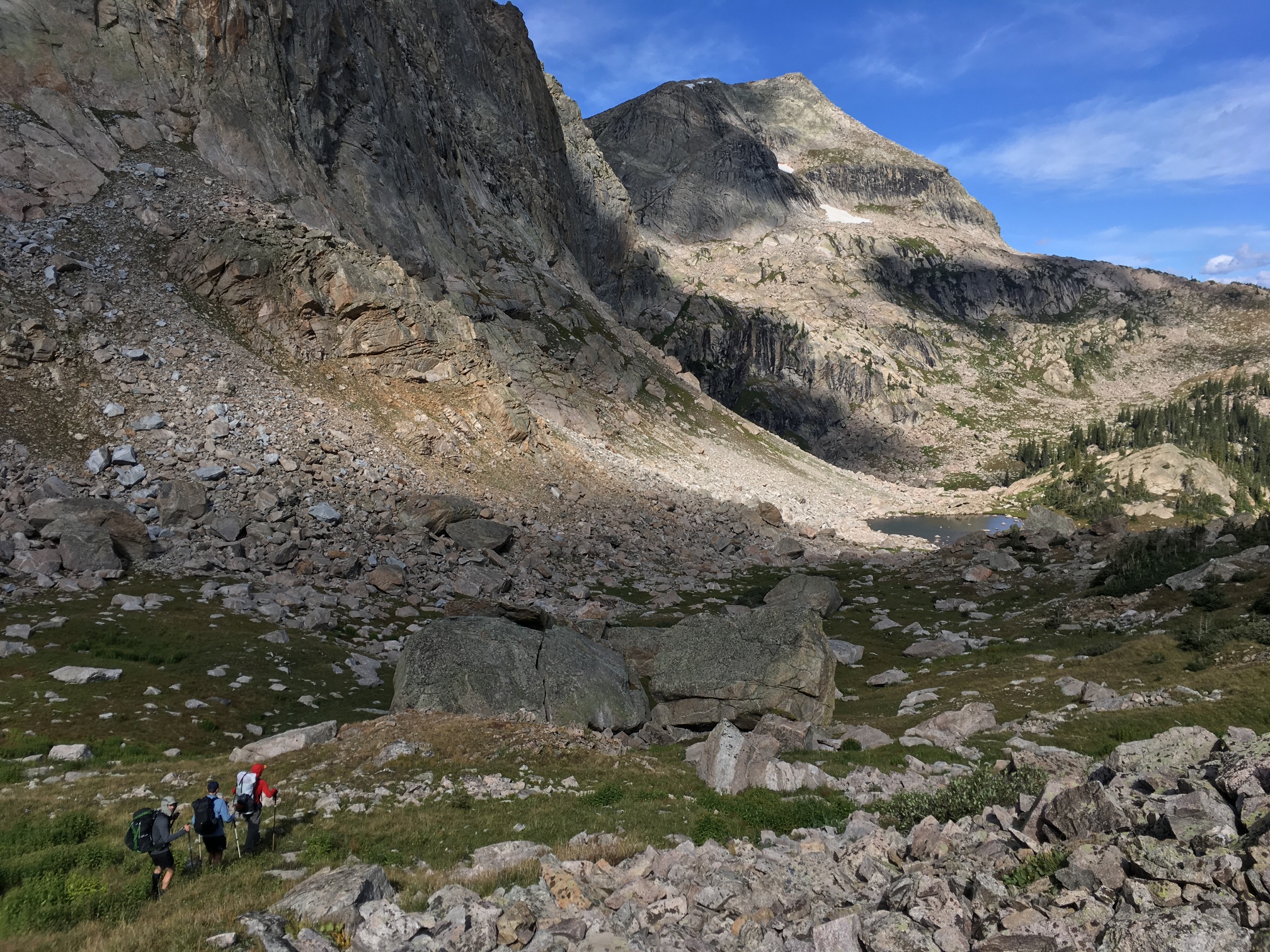 Day 2: Time to step off trail. We walk past Lake Verna to the end of Spirit Lake (the next lake in the chain) and hang a left to head straight into the woods and the fucksticks - Alan's terminology for blowdowns. No one says blowdowns again the rest of the trip after hearing this. After a steep climb out of the woods we walk into an alpine landscape that is everything that I love about Colorado. From here we walk over the pass below Ptarmigans Beak and then down to a tarn where we take a minute to do a reset dry on our sleeping bags and shelters. Next is a talus field we have to cross to make it to the next pass below Andrews Peak. Just after crossing the talus field we hear a crack of thunder. Turning around I realize that it's not thunder but a giant piece of rock breaking off from Ptarmigans and falling down towards the talus we just crossed. It doesn't tumble across the route we just walked, but it gets close. It would have been a pretty anxious moment had it happened 20 minutes prior.