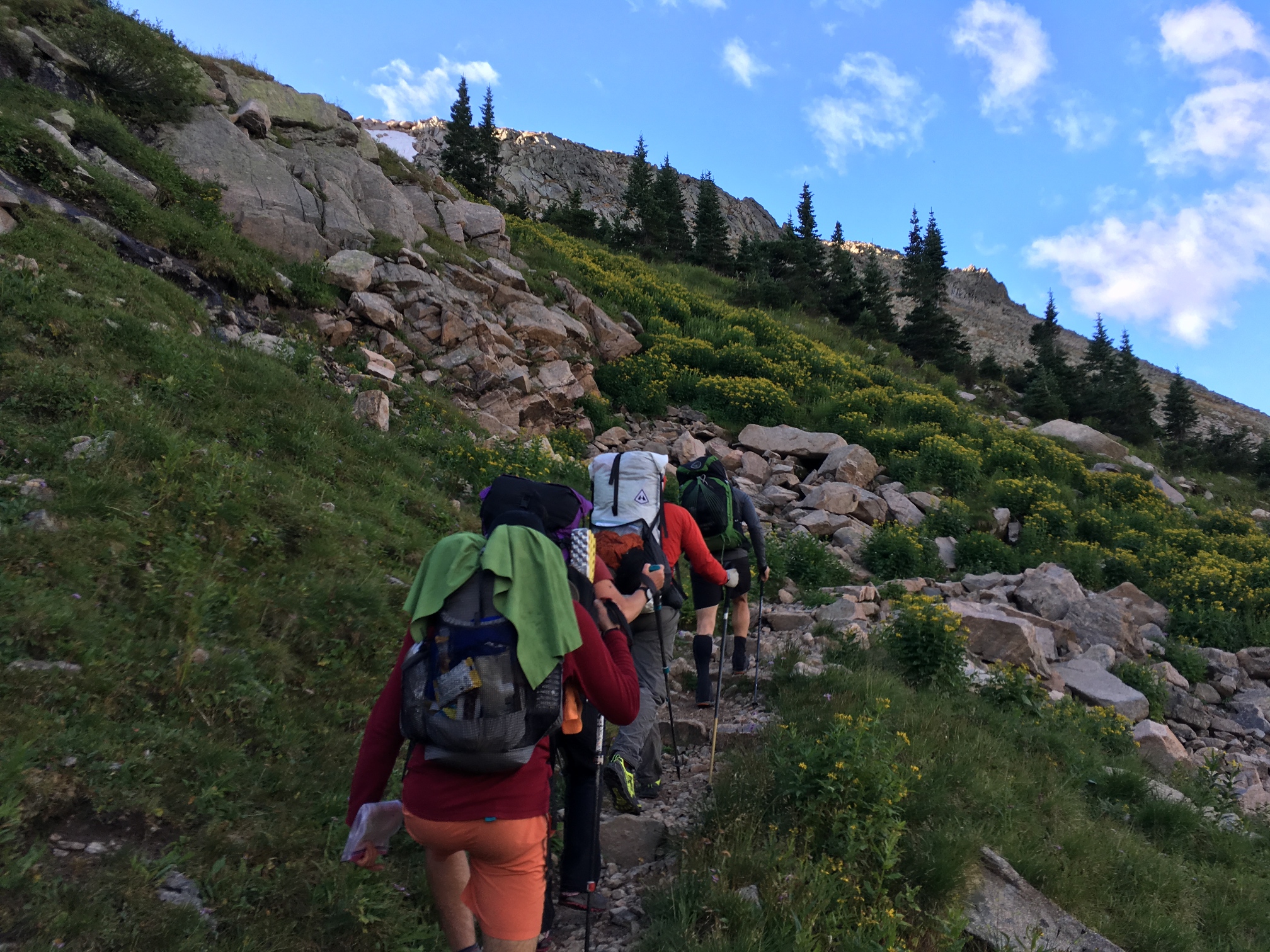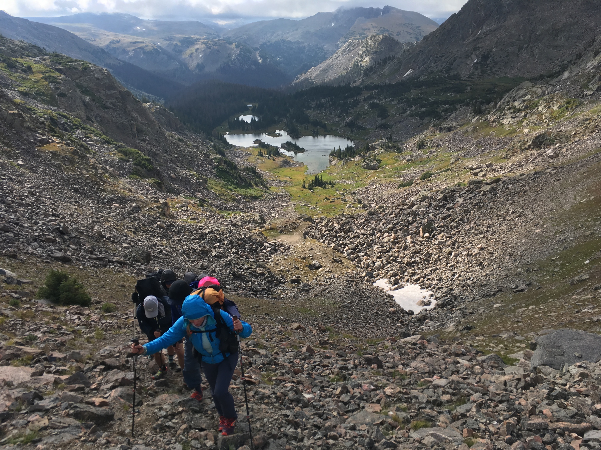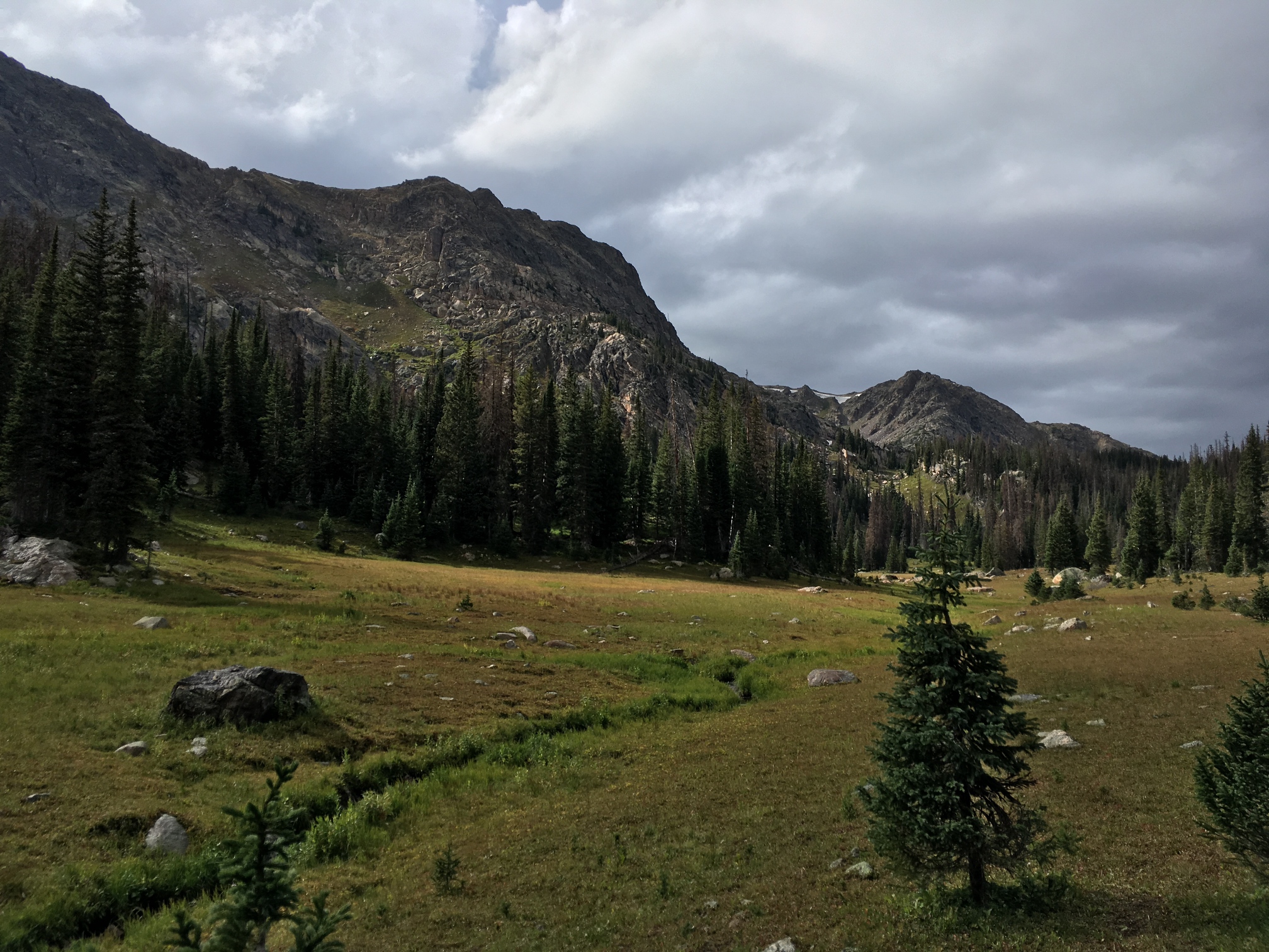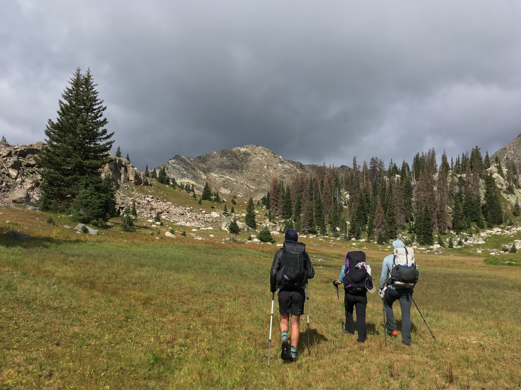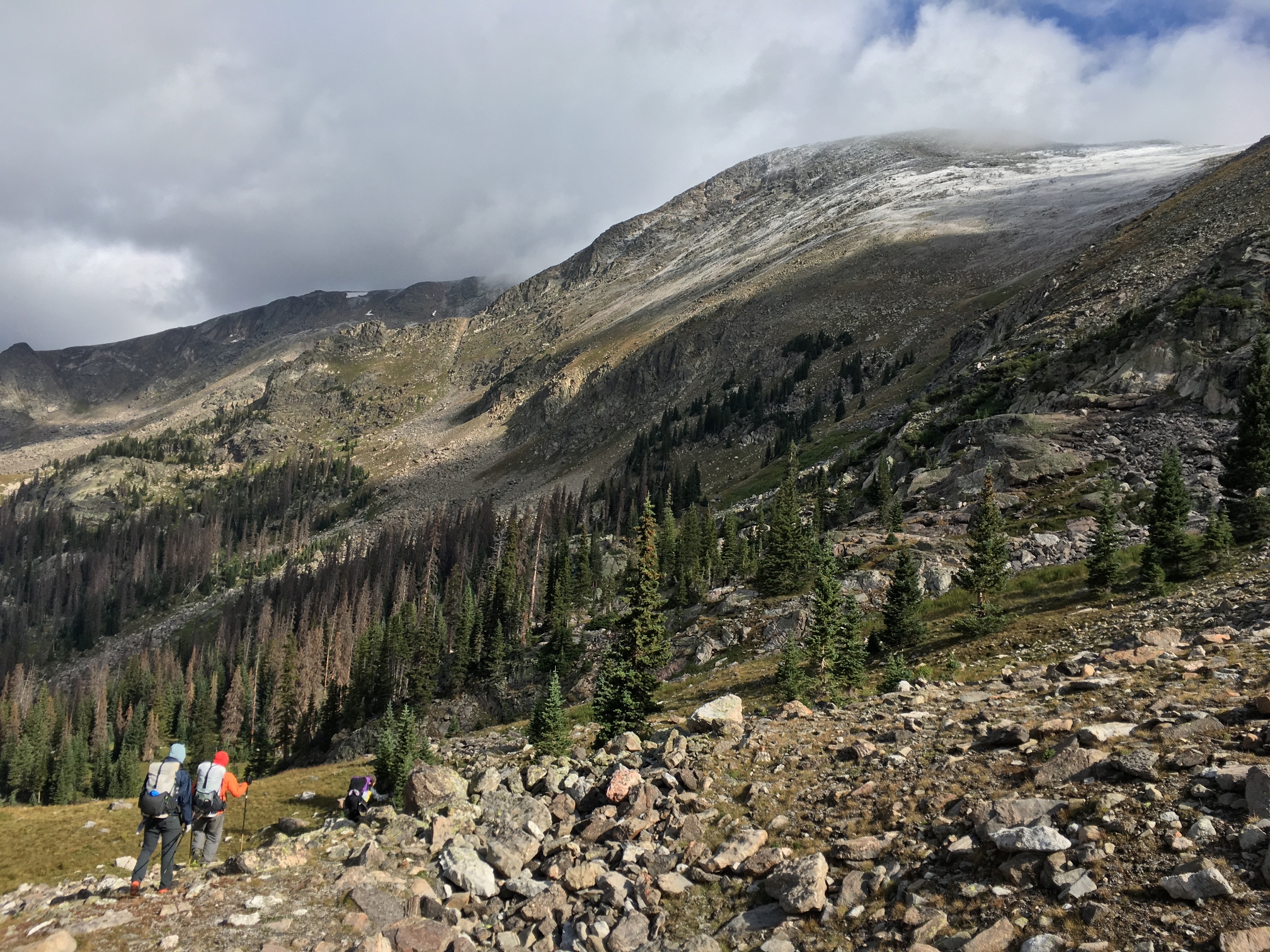 Day 3: We get an alpine start in the morning meaning we wake up very early to start walking because the weather is supposed to really suck. The forecast is for thunderstorms by early afternoon and we have to walk across the divide before that happens. By 8am clouds are already building. We're hoping to be able to walk up to Taylor Peak along the way, but it's a weather dependent situation. By the time we get to the decision point it looks terrible. I've spent a total of 6 years living in Colorado, so I know how quickly the weather can turn here. Perhaps to instill a little fear in the folks who haven't had direct experience with Colorado weather, Alan tells the group that he'll go up Taylor but only if we're ready to hike down in thunder and lightning with "50 mile an hour winds and 35 degree rain." I can't square the idea of wanting to do something with that potential outcome so I skip the peak after teetering in the middle between both options while each group walks away from me. The group that goes up only gets sleeted on and experiences mere 30 mph wind. In the end I wish I had braved the weather, but Alan wasn't wrong about the potential for it to take a bad turn.