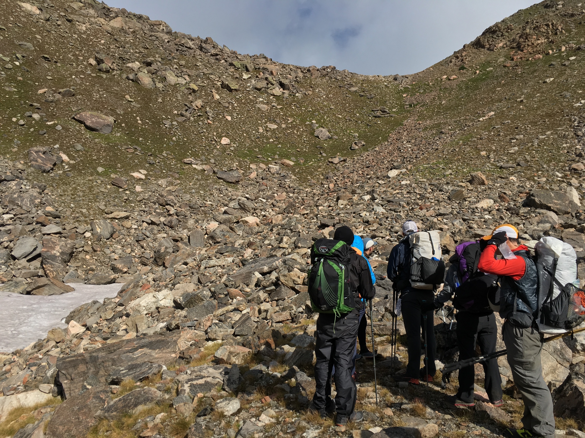 We start up our pass as the forecast sun starts to break through the clouds. There's a talus route to a bench halfway up then a grassy slope to the top. Once we're up we can see back down to Haynach behind us and over into the next valley in front of us. There's fresh snow on the rounded peaks above our path as we walk down towards Julian Lake. At Julian I grab a liter of water before we head back up again.