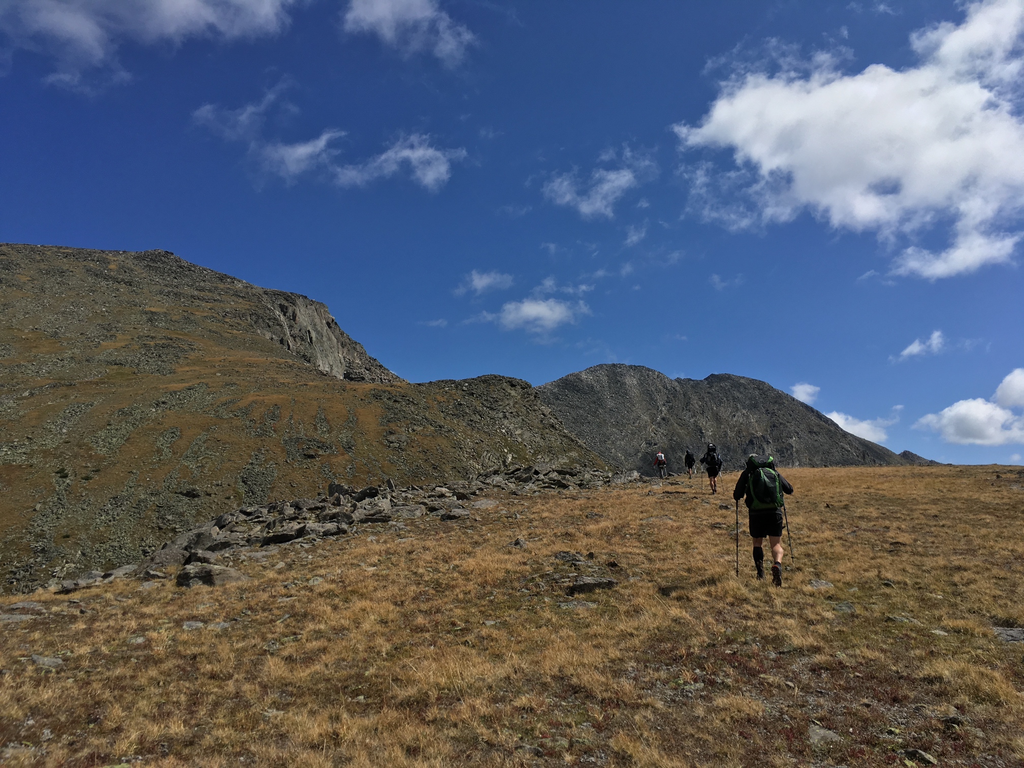 Last year I joined Andrew Skurka for a hike through the Kings Canyon high country on part of the Kings Canyon High Basin Route (KCHBR), and this year I hiked with a couple of folks who guide for him in Rocky Mountain National Park for a portion of the Pfiffner Traverse. Both routes are substantially off-trail but they have a very different character. The KCHBR is a rocky moon-scape with perfect weather while the Pfiffner is carpeted with green and gold grasses and frequently threatens to weather on you. Both are great. Here's how it went in Colorado. There's more commentary after the pictures.