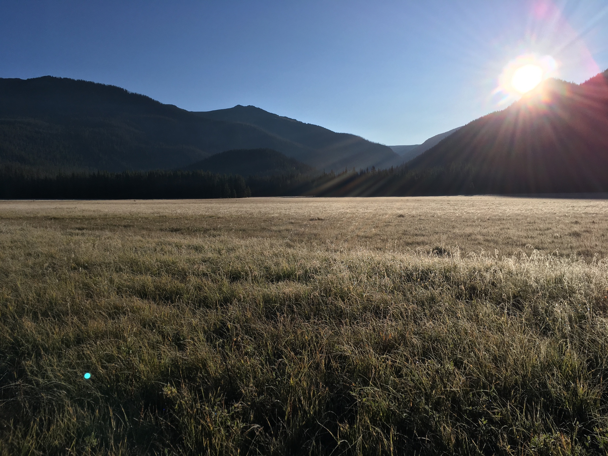 At this point we're basically done with the high portion of the route. Thinking there's not much left but walking on trails through trees, we come upon Long Meadow. After spur of the moment suggestion by Rachel and Alan to walk it in silence, we spread out and have a magical stroll through the grass where there's evidence that all matter of large animals bed down each night. Later, after we've resumed talking, the meadow turns into something more like a bog. We're supposed to camp here, but it's way too wet and we have to keep searching. Eventually we find a dry spot and everyone crowds into a nearby stream to wash the bog off of our legs.