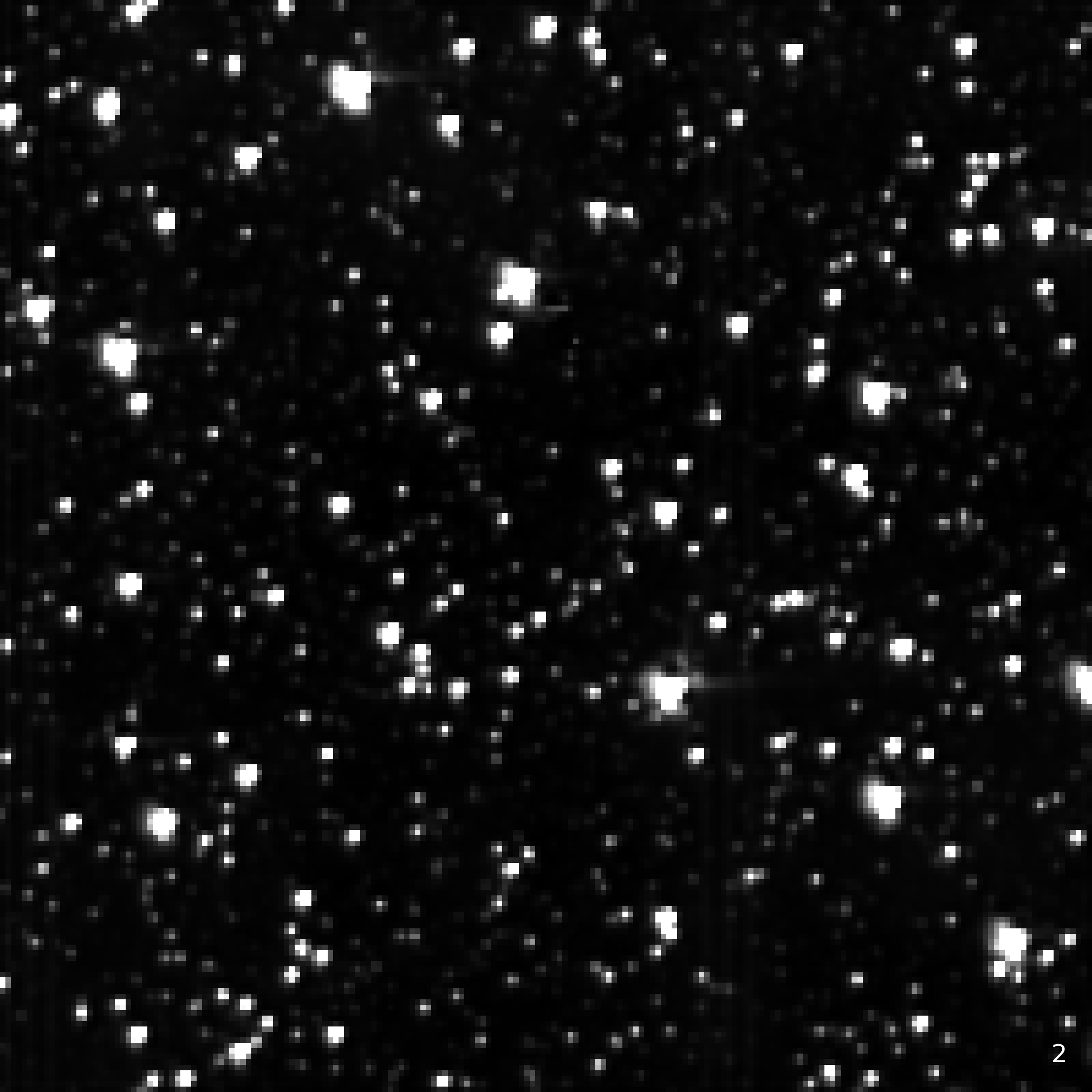 3. These frames are the image set 2 frames with a static sky template subtracted. You can see some large relatively fast objects in motion, but those are not what we're interested in here. 2003 UZ413 is much smaller and considerably slower. You can't see it in these raw difference images.